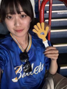 プロバスケットボール観戦に行き、購入したプロチームTシャツを着る山崎さん